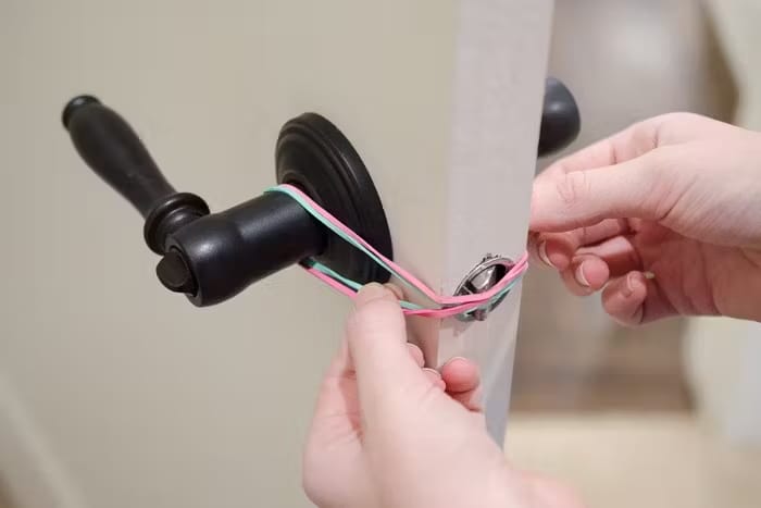 Wrap a rubber band around the door handle, and you'll have one less oopsie to worry about. 🙂